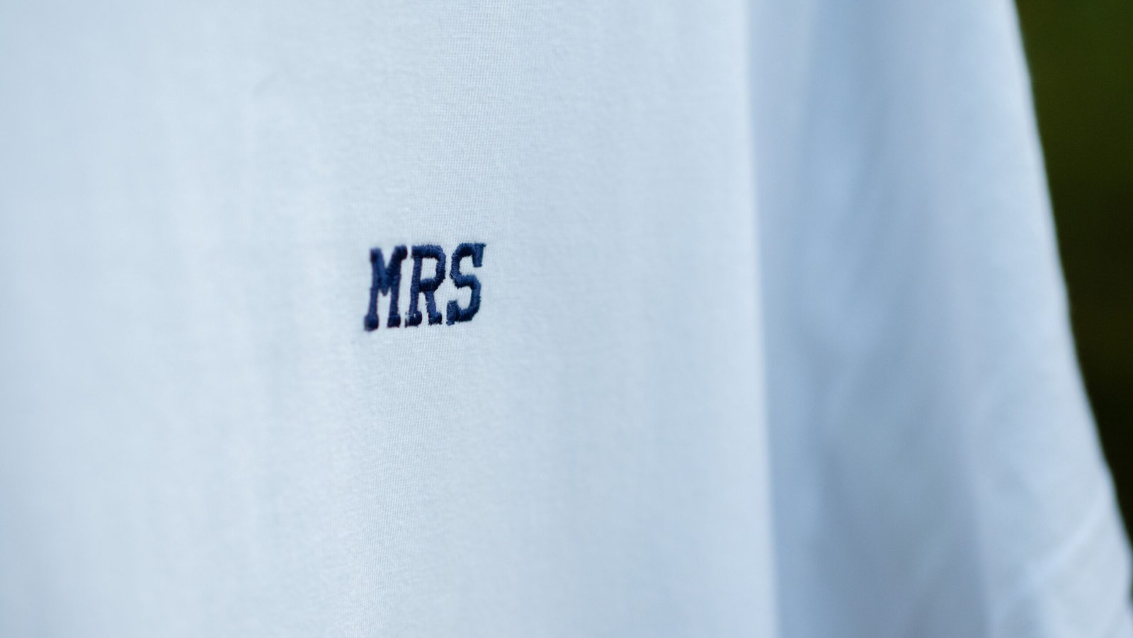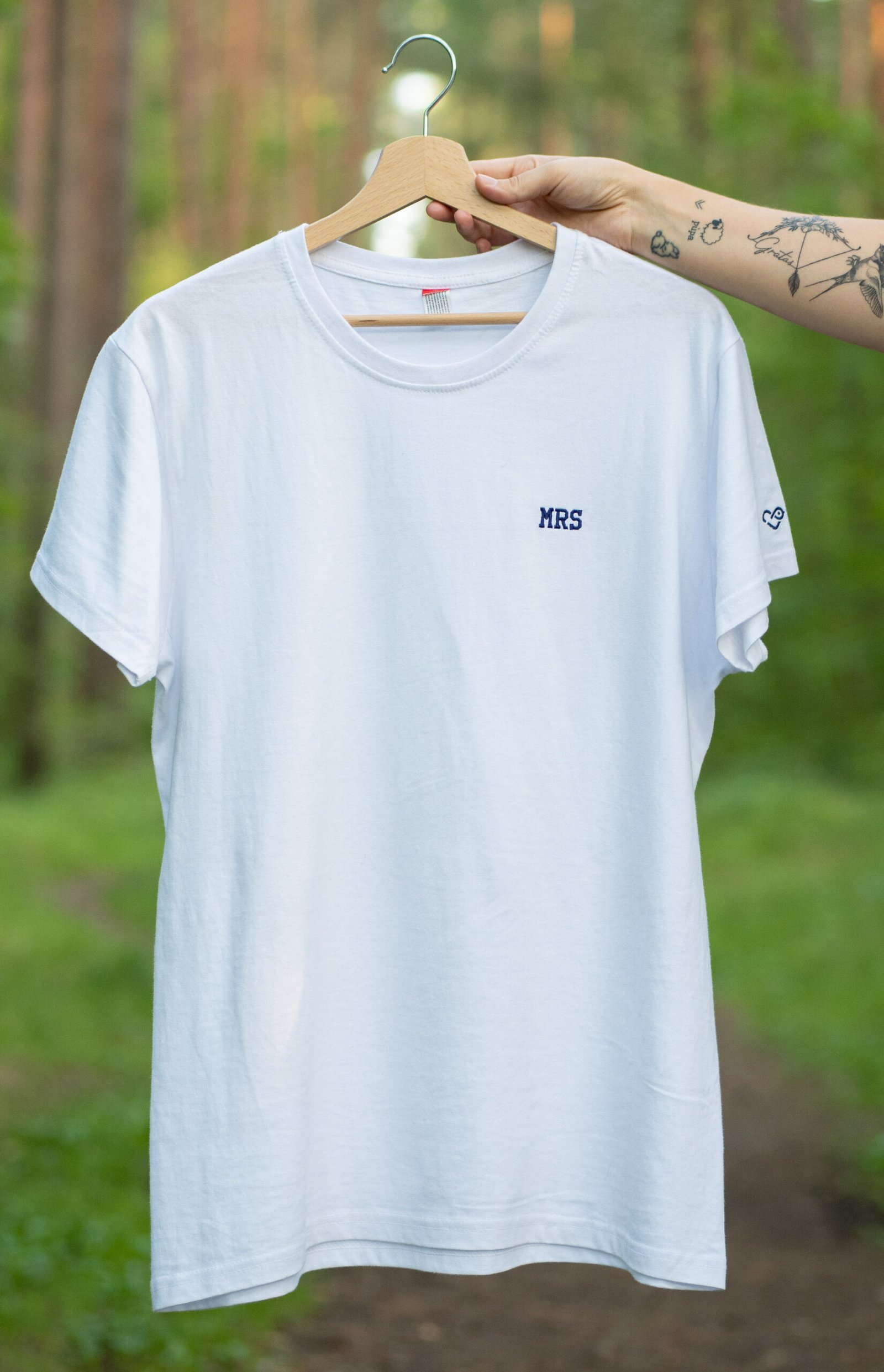 Marškinėliai moterims MRS, ant rankovės Lovebirds logotipas. Spauda – siuvinėjimas.